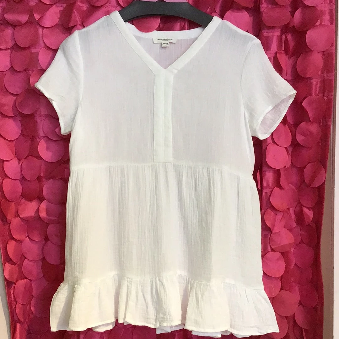 WHITE COTTON V NECK SHORT SLEEVE TOP WITH RUFFLE BOTTOM