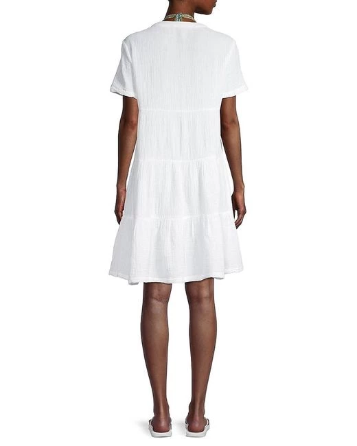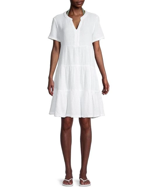 A minimalist summer dress in a tiered silhouette and with a gauzy crinkled finish. Splitneck. Short sleeves. Pullover style. Cotton. Machine wash. About 37″ from shoulder to hem. Model shown is 5’10” (177cm) wearing US. Small. Color: white