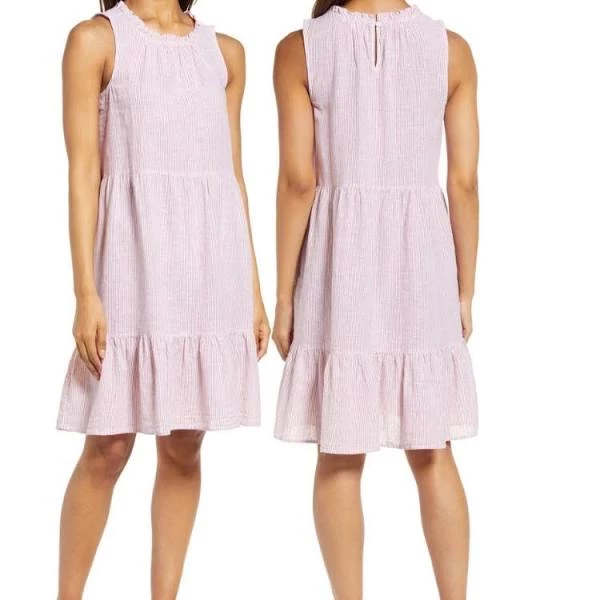 Lightweight Linen Blend Sleeveless Sundress. Features A High Ruffled Neckline With A Single Button Closure At Back Of Neck. Tiered Ruffle At Hemline. Semi-Sheer Linen Blend Material Works Well As A Swim Coverup Or Over A Slip. In Color Lychee.New Without The tags.