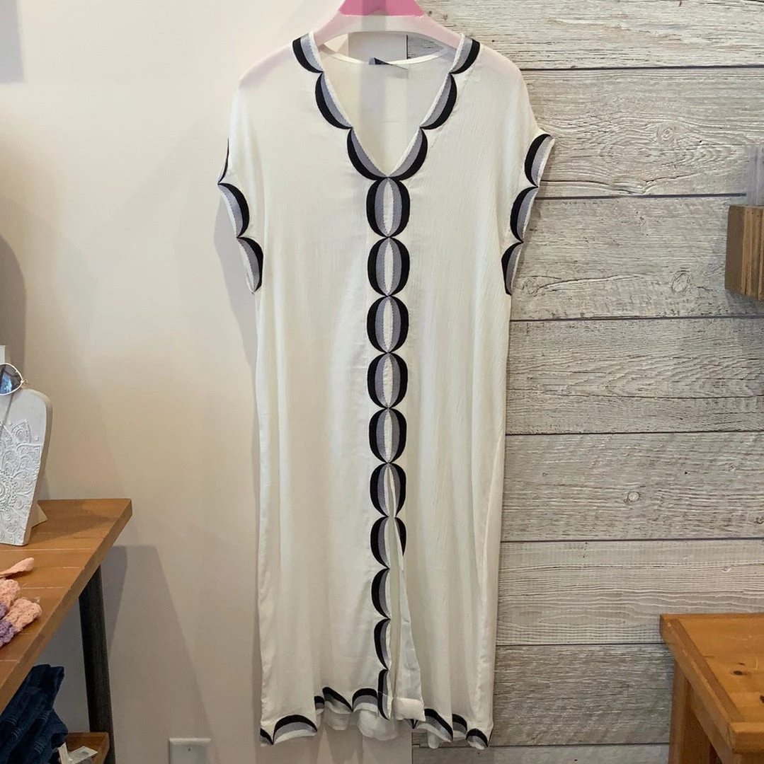 Perfect v-neck kaftan, slit in front with geometric pattern down front, bottom and on sleeves.