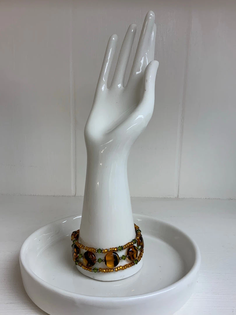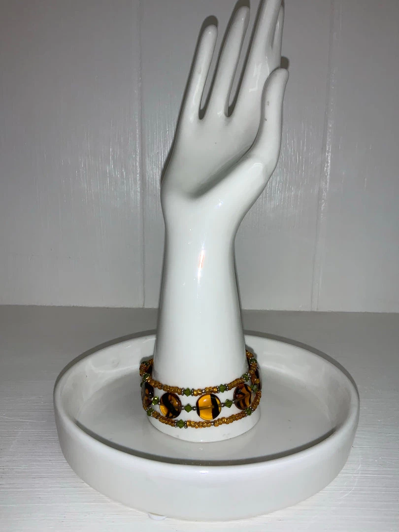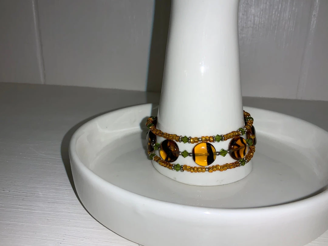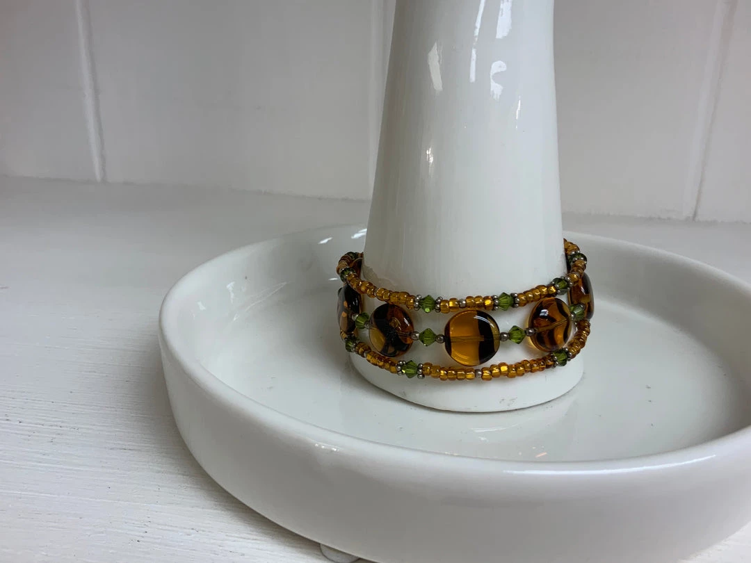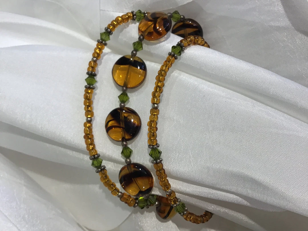 Three stands of beads with amber glass, gold beads, and green crystal beads.
