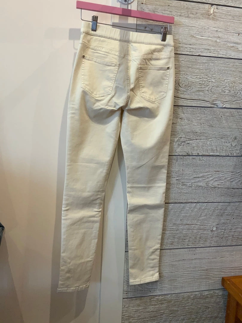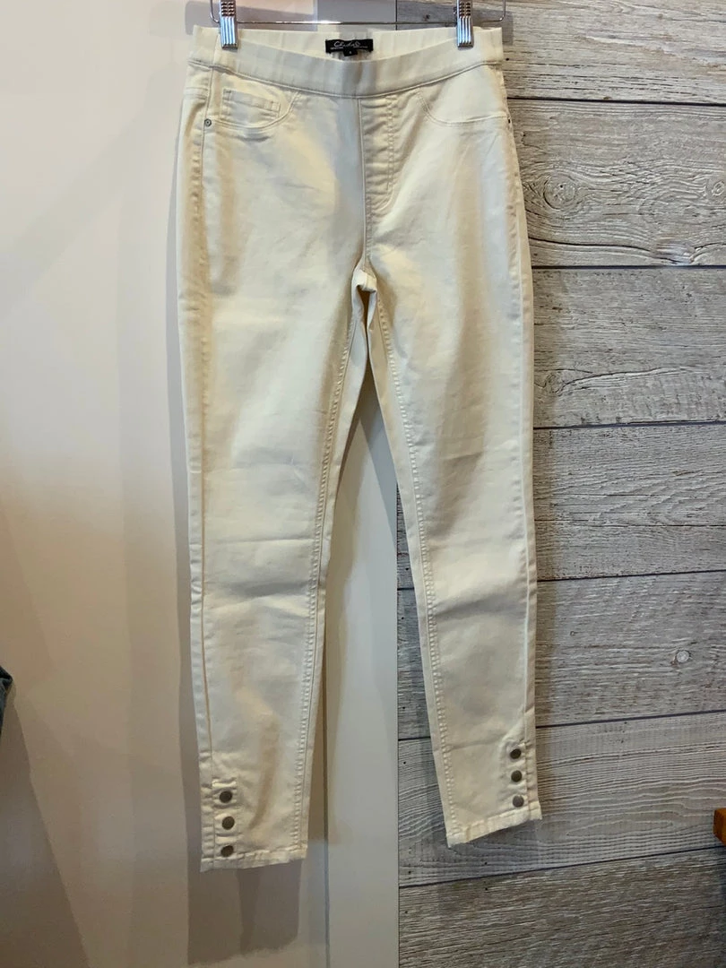 Mid-rise, pull-on style pants that have a slim fit. 3 snap buttons at botton hem.