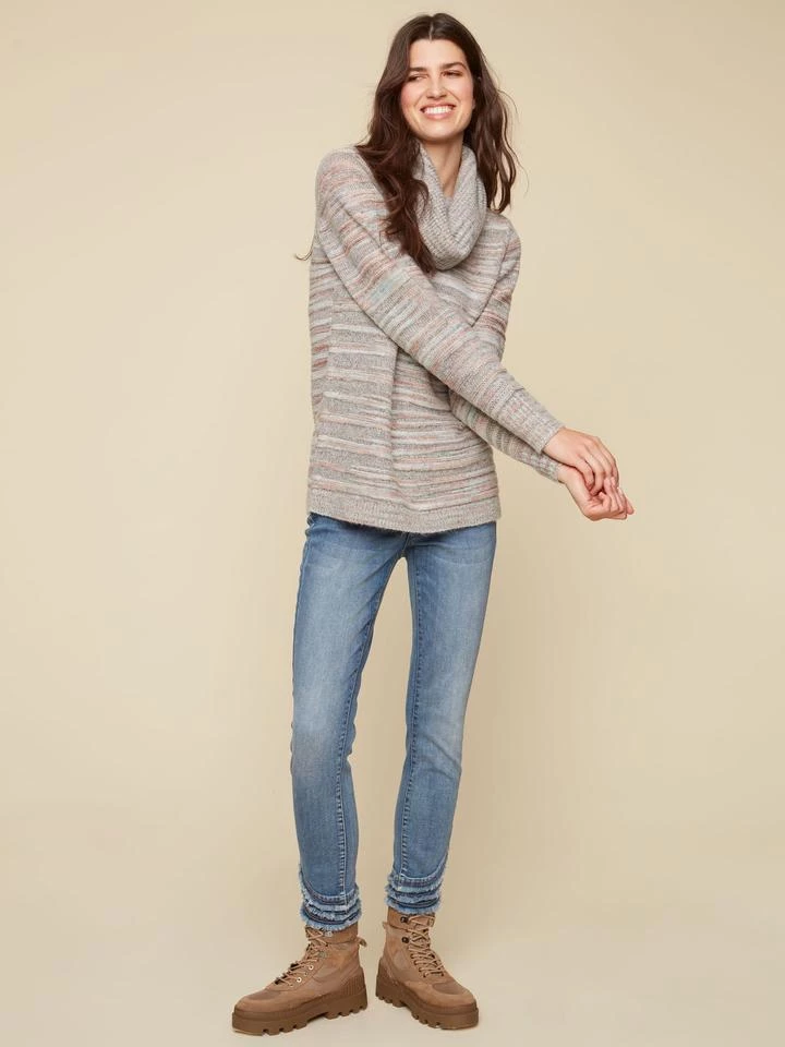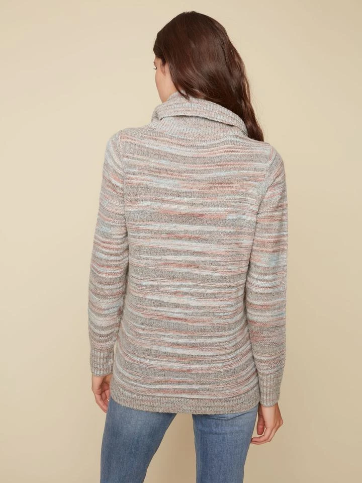 Make every day comfortably stylish with this long, soft cowl neck sweater in light rosé and grey tones.