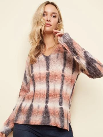 Stay cool and collected in unpredictable fall temps with this soft knit sweater featuring a flattering V-neckline. The tie-dyed pattern is printed right on the knit, and a short split on the sides ups the comfy factor.