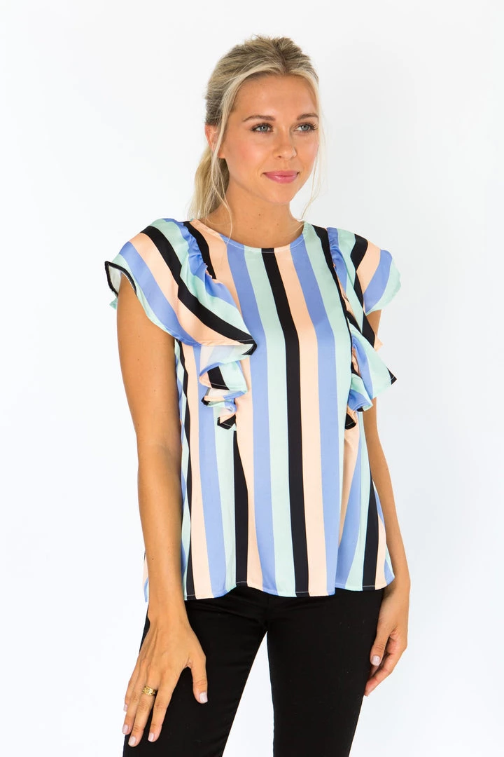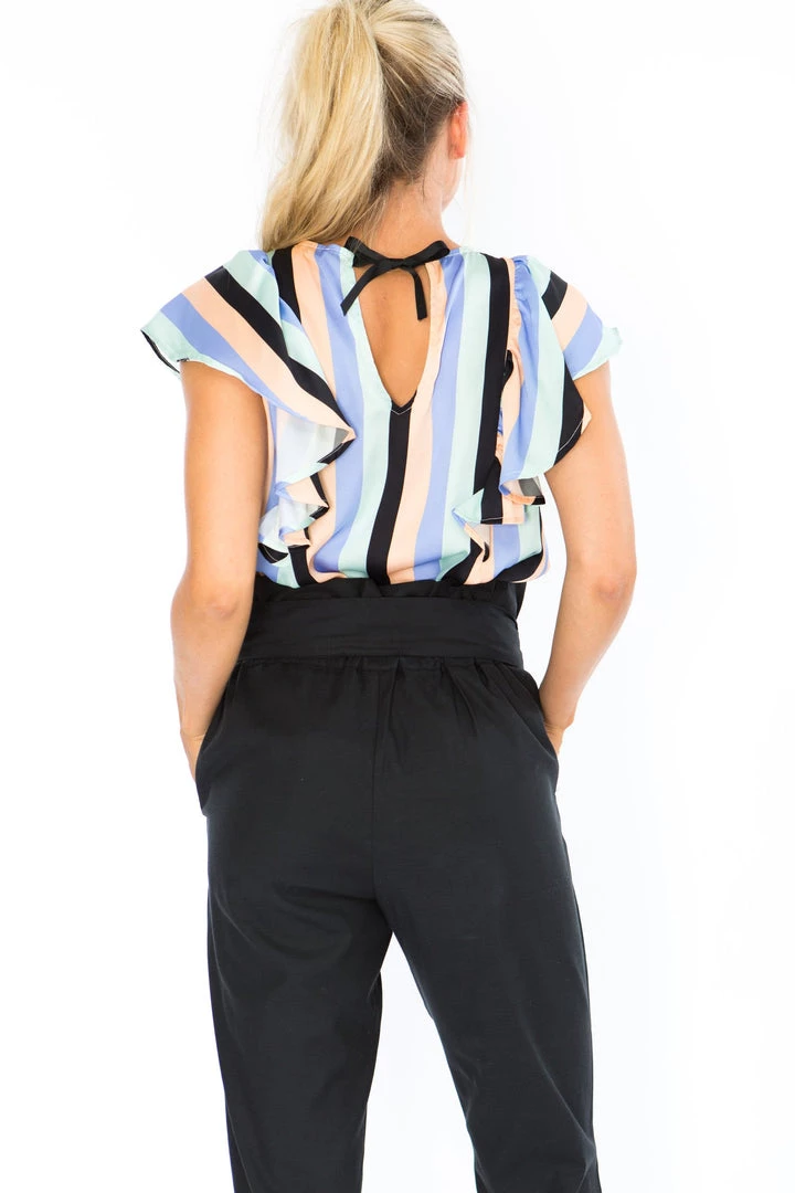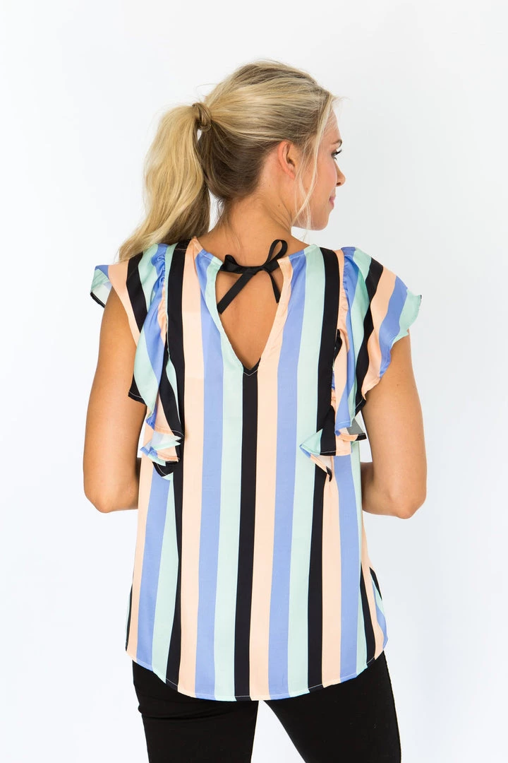 Sweet top of woven satin with ruffle cap sleeves and colorful stripes is finished with a delicate and feminine bow that ties at the back of the neck. Can be worn out or tucked in for the perfect silhouette. Hand wash cold, dry flat.