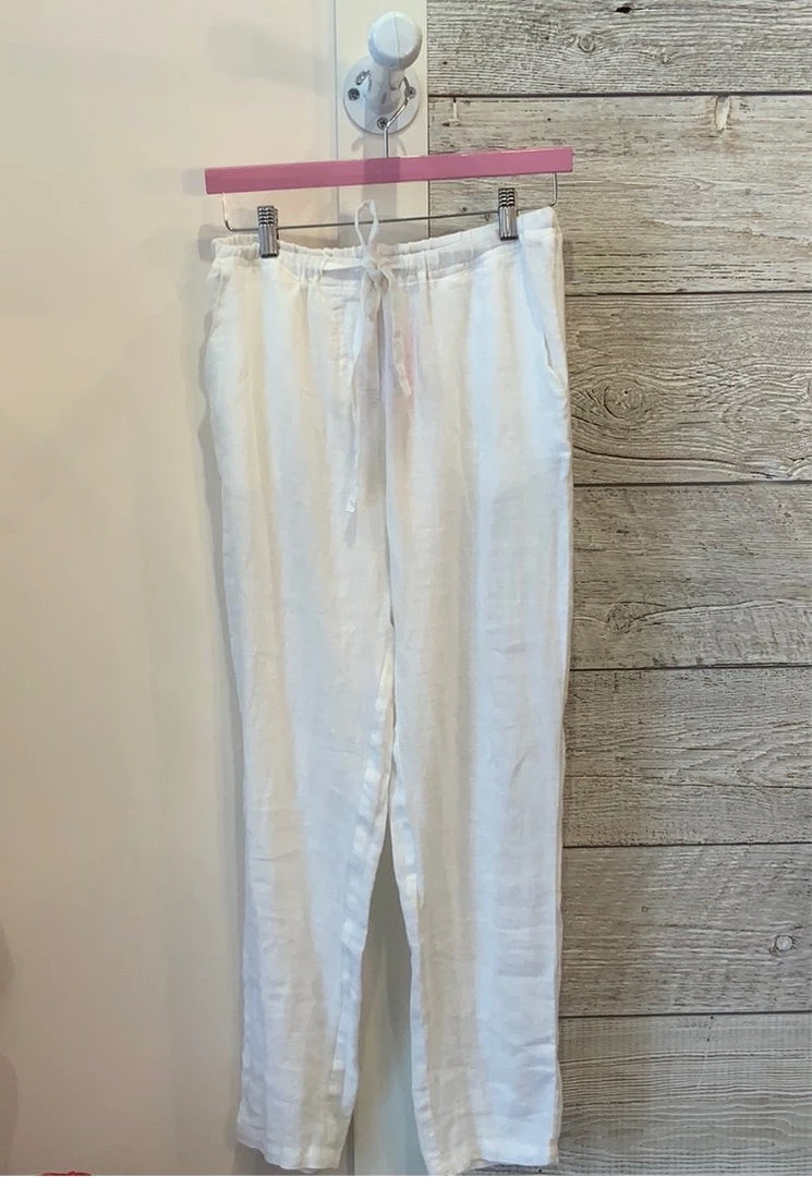 These are the perfect summer linen pant that has pockets and taper at ankle. you can roll them up. too! Drawstring tie waist.dolma