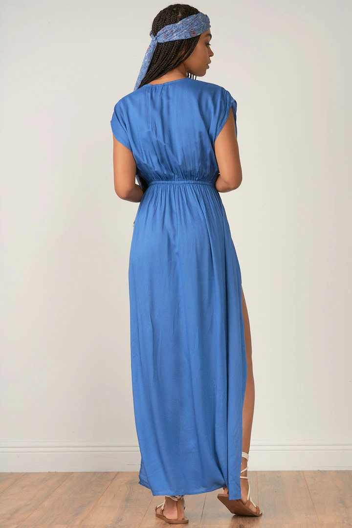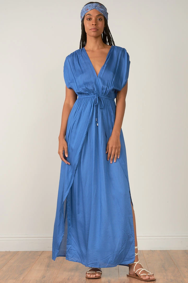 Stunning maxi dress in layers and deep v-neckline. Flattering tie waist