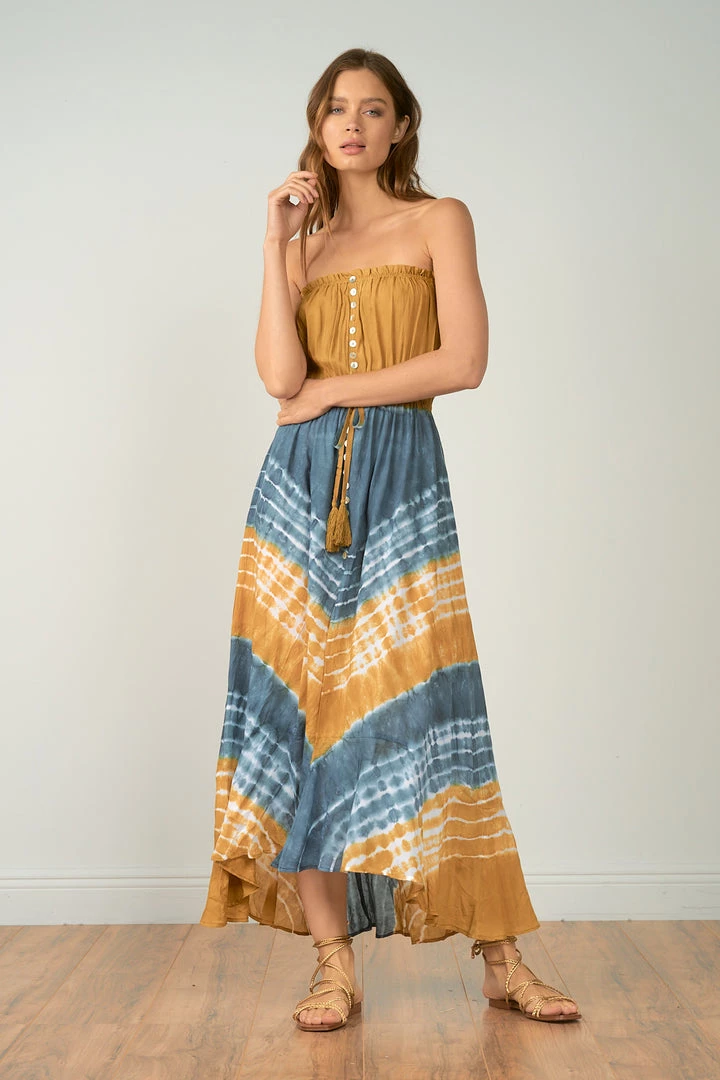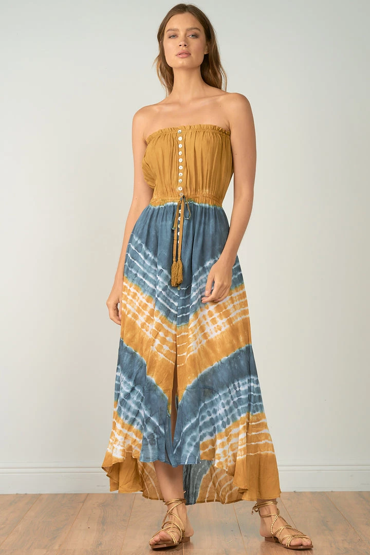 This strapless maxi dress is gorgeous in gold and navy tie dye accented in stunning white shell buttons and asymmetrical ruffle hem.