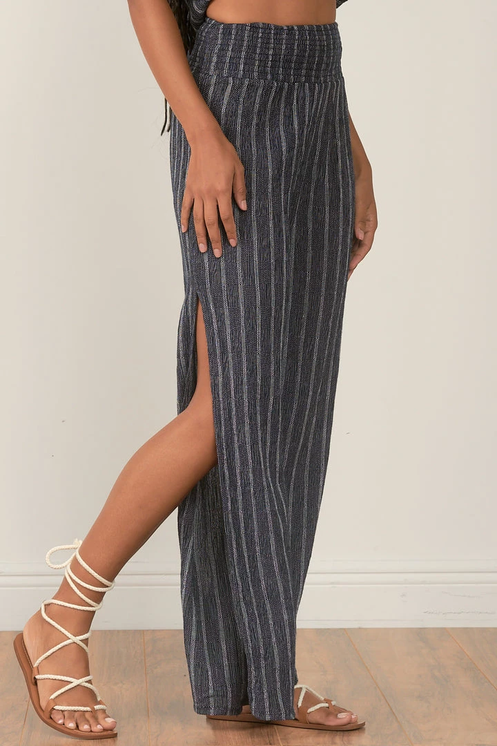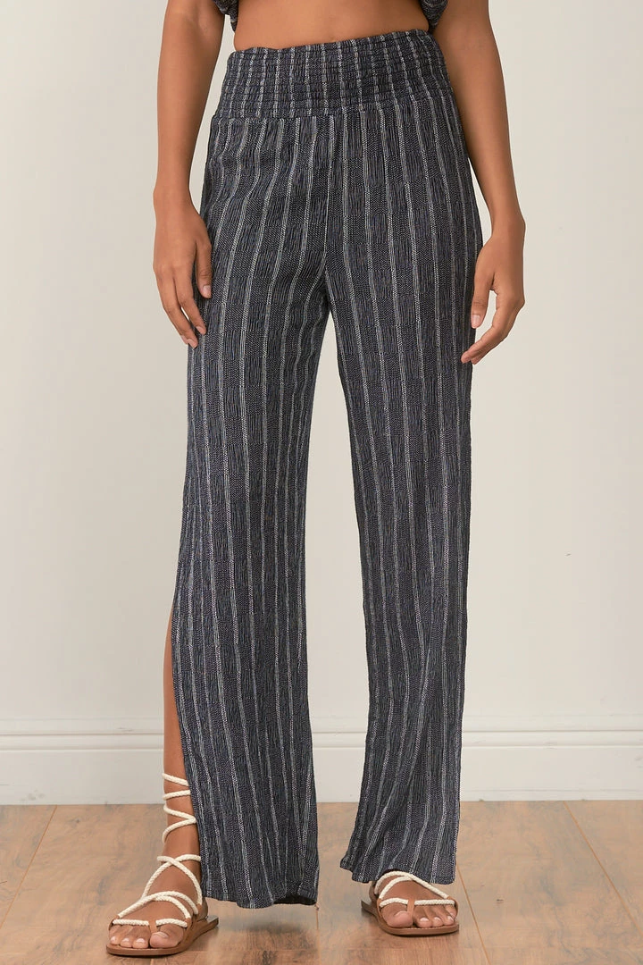 Chic black stripe textured pant with side slits and smocked waist that is so flattering! Pairs with Runway stripe tank top.