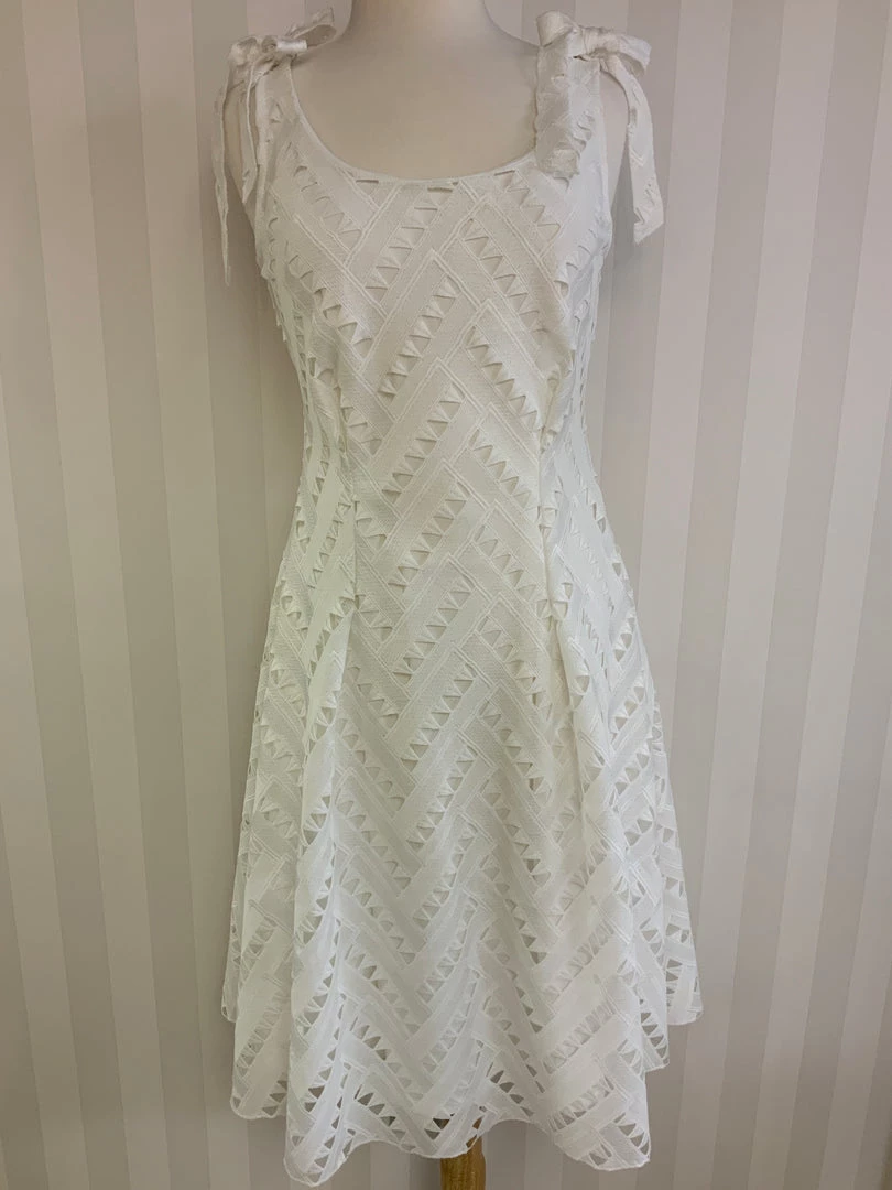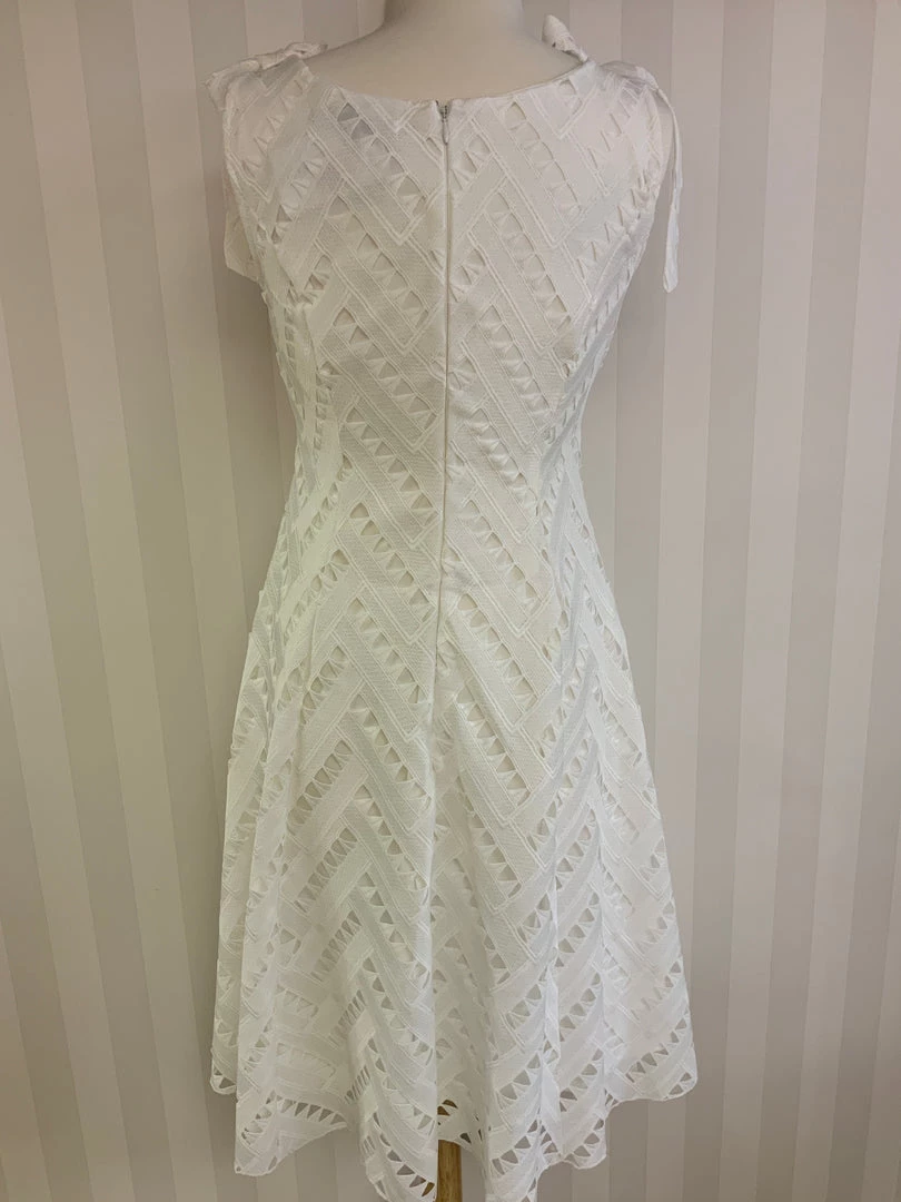 This is a stunning dress! It is fully lined with cut out triangular patterned overlay. Adorable tie shoulders! This is a fabulous summer dress! Darted and Flare bottom.
