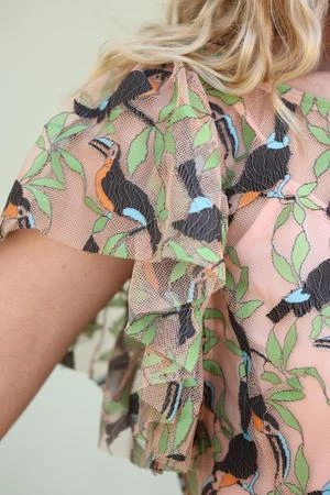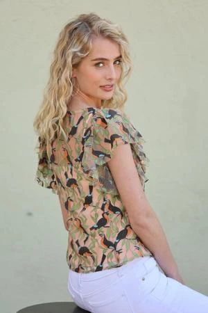 Feel all the tropical vibes with this fun print featuring the toucan! Inspired by their colorful bills and tropical home, this top boasts bright, light and breezy features and is one of a kind!