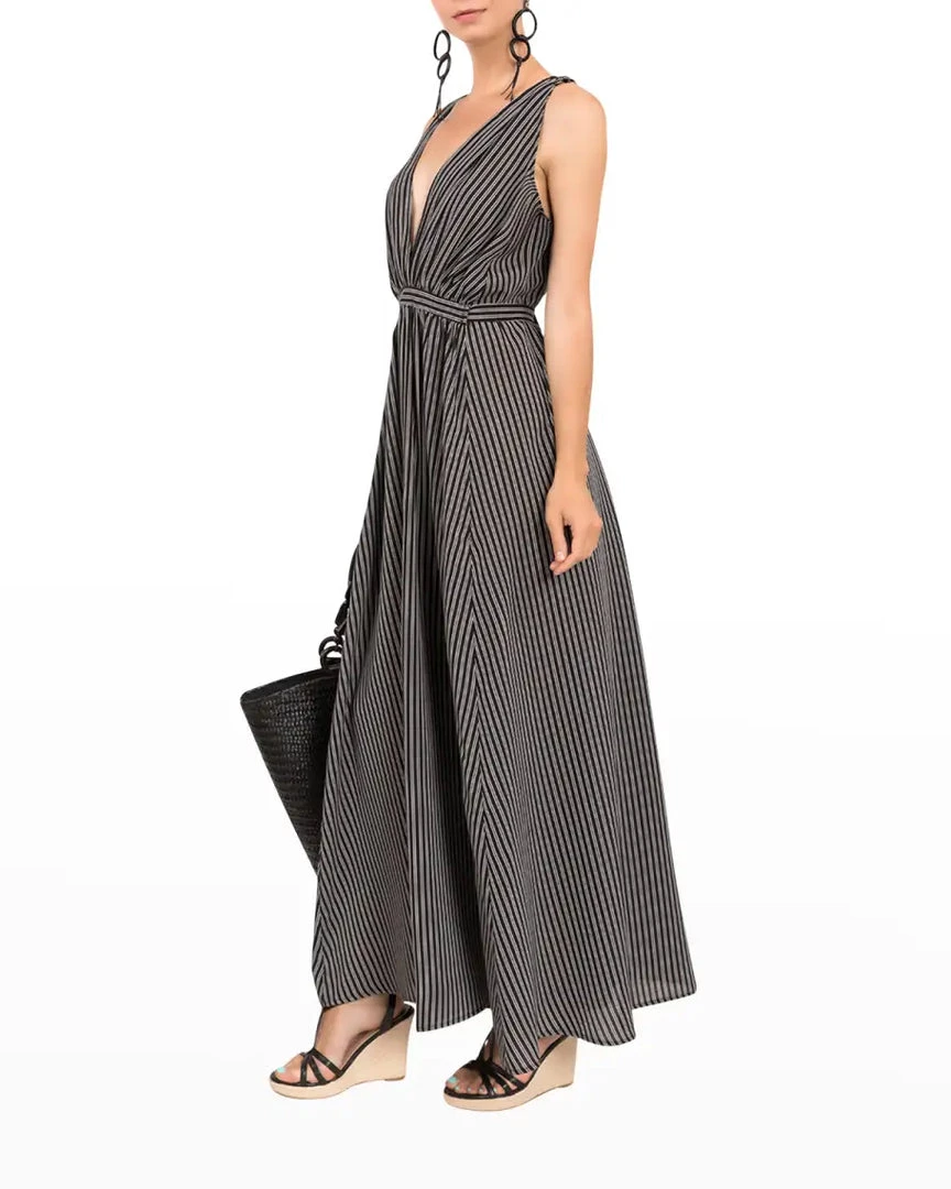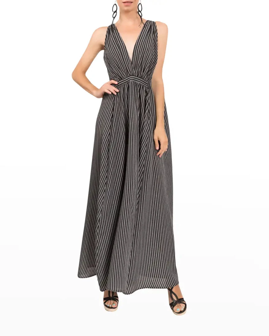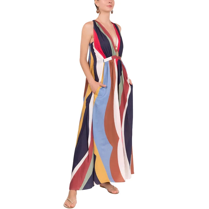 Stunning deep v caftan featuring empire tie back. Tie back can be tied hidden inside behind the back or visible on the outside.