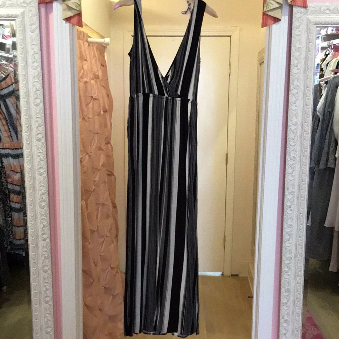 Cotton, v neck halter long dress with tie in back, black and white stripe.