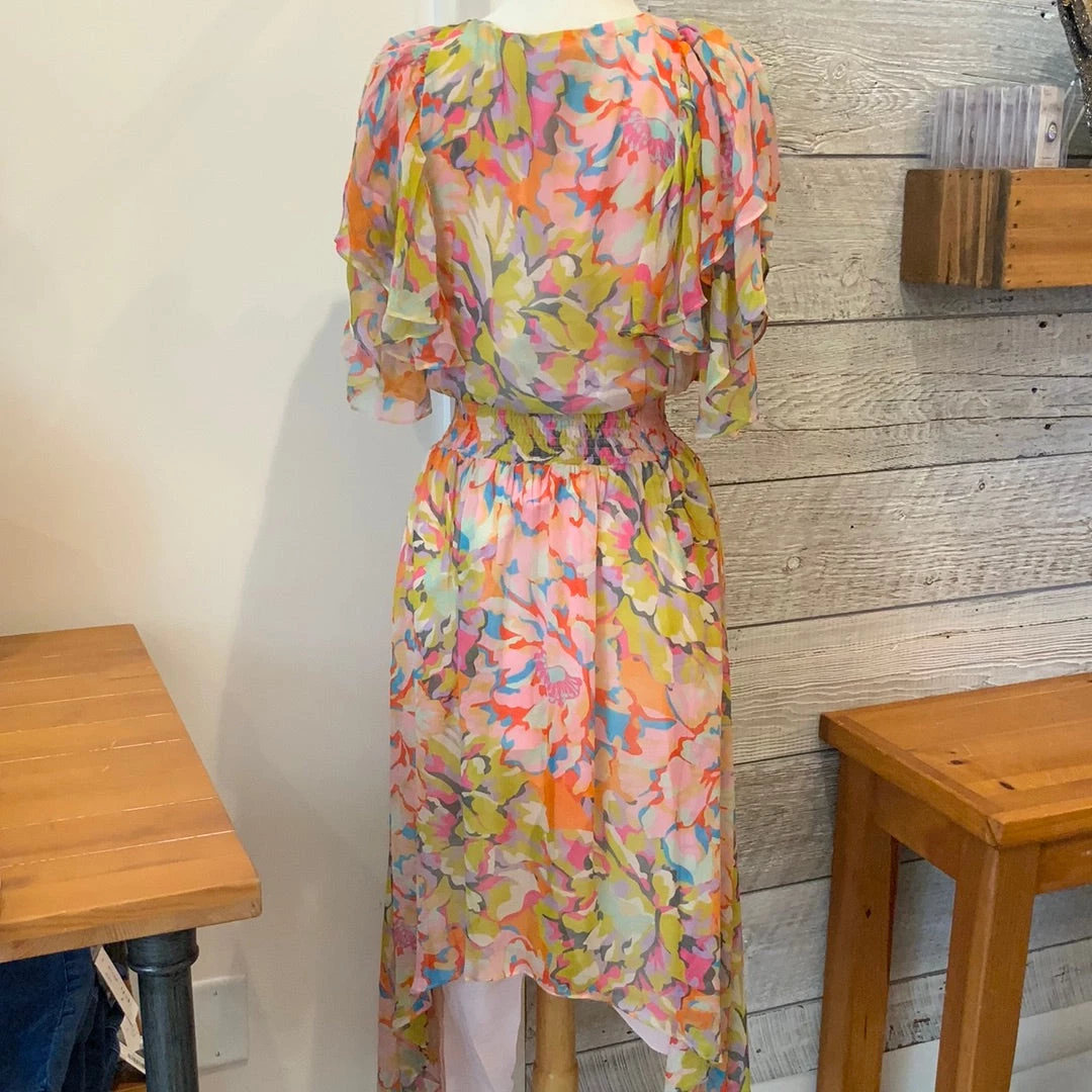 Gorgeous layered chiffon dress with v-neck line and butterfly sleeve in gorgeous prints! This dress is so perfect for any summer occasion!