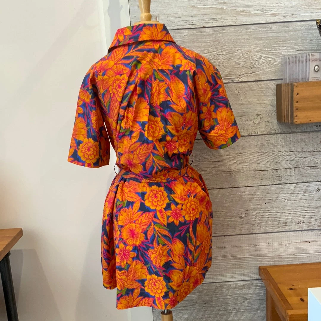 Cotton poplin shirt dress that buttons down and ties at waist.