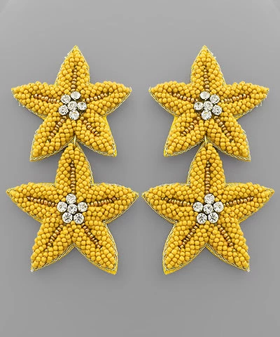 Yellow beaded flower earrings with gold and clear rhinestones centered.