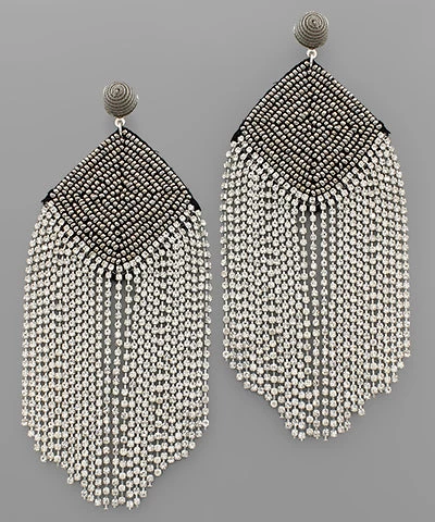 DARK SILVER BEADED SQUARES W/ CLEAR CRYSTAL TASSELS. THESE EARRINGS MAKE A STATEMENT