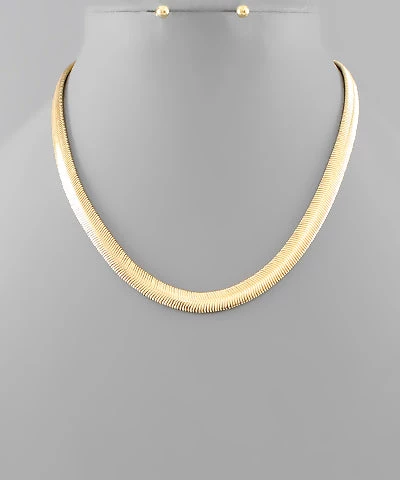 8 MM SNAKE CHAIN NECKLACE MAKES THE PERFECT ACCESSORY TO ANY OUTFIT WITH COORDINATING SMALL ROUND STUD EARRINGS.
