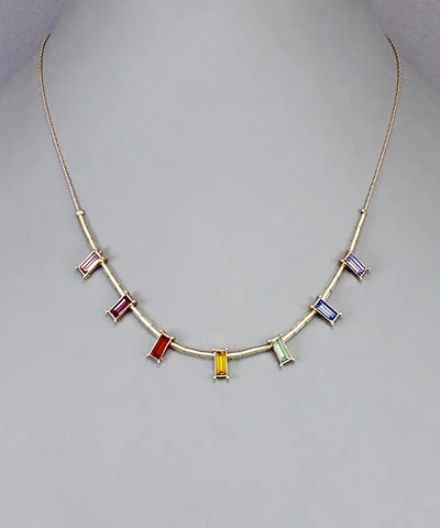 Thin gold chain necklace adorned with multicolored rectangular jewels