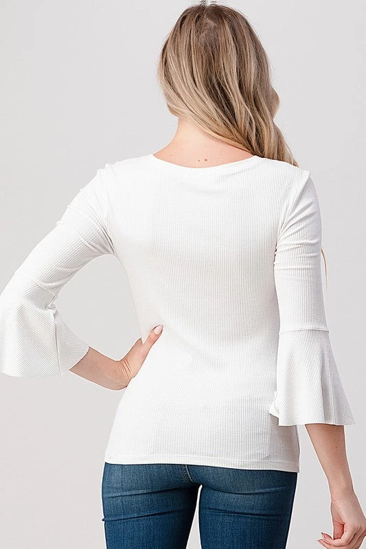 3/4 LENGTH TRUMPET SLEEVE RIBBED CREW NECK TOP. WHITE. GREAT BASIC TOP WITH A FLAIR.