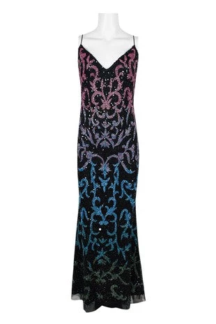 Spaghetti strap V neck dress with embellished mesh and zip up back.