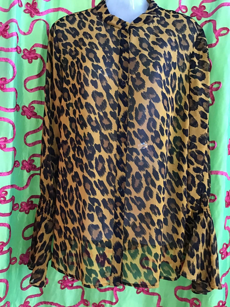 Fashion forward and flirty semi-sheer button down long sleeve poet style blouse perfect for office to a night out on the town. The collarless style is on trend and perfect for accessorizing with your favorite necklace. Elastic gathering at wrists gives a fun ruffle around the hands. Tailored fit and hip length hem that can be worn out or tucked in to your favorite bottoms. Metallic threads add a hint of glamour.