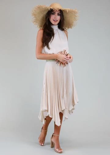Holter neck dress with pleated bottom and midi length. Easy and elegant!