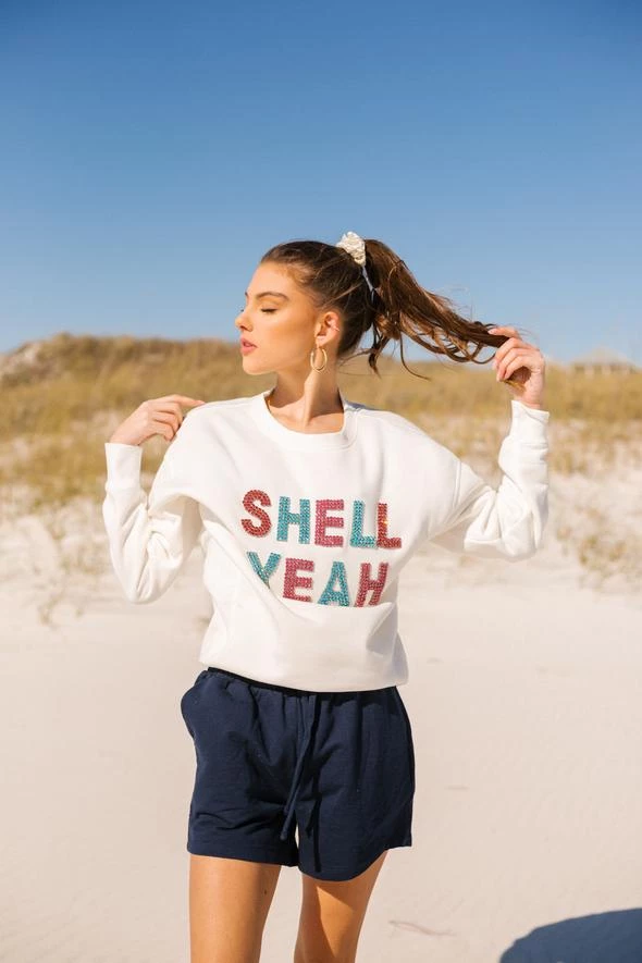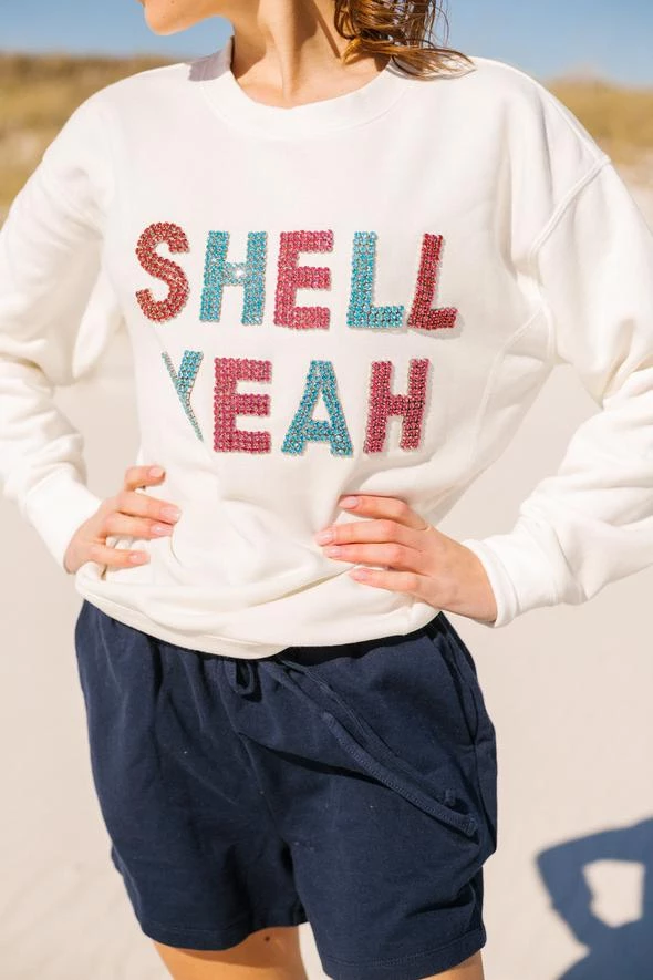 You’ll be on island time in the Shell Yeah lounging top! This turquoise and pink heavily encrusted rhinestone lounge top is made from soft knit fabric and features the cutest play on words with sparkly multicolored letters!