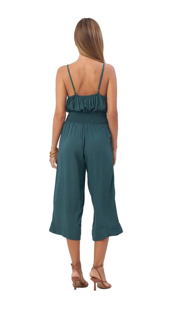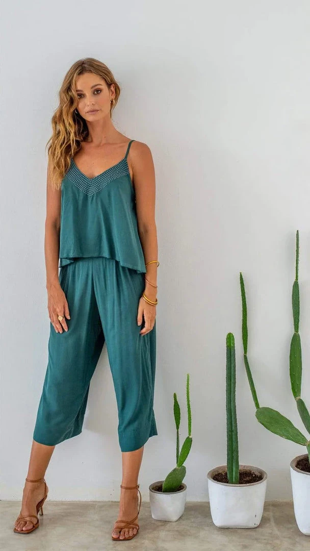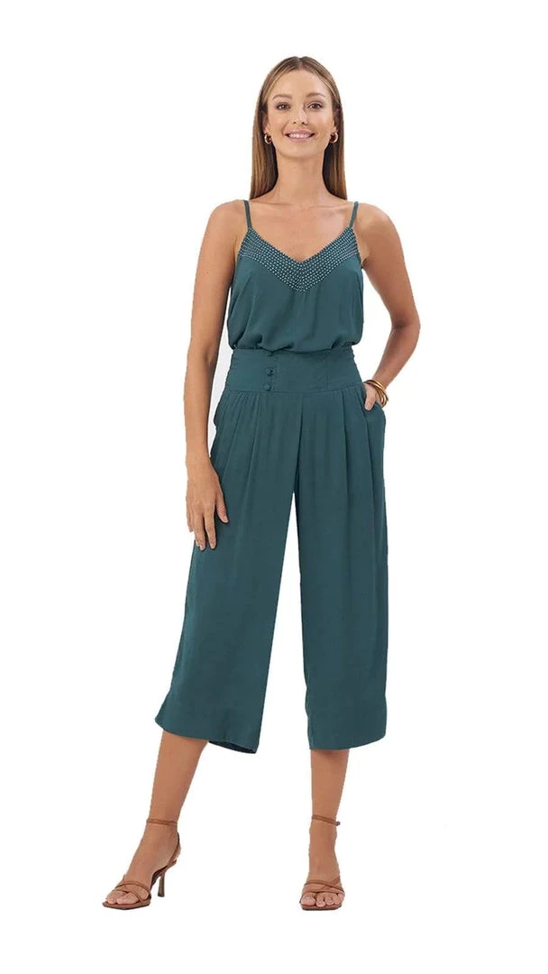 wide waistband capri pant, back elastic, front button detail, and side pockets.