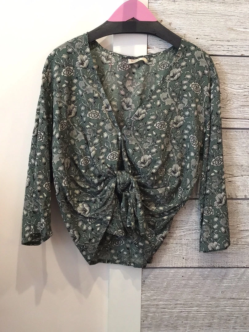3/4 bell sleeve, deep v neck, button closure, long tied crop blouse