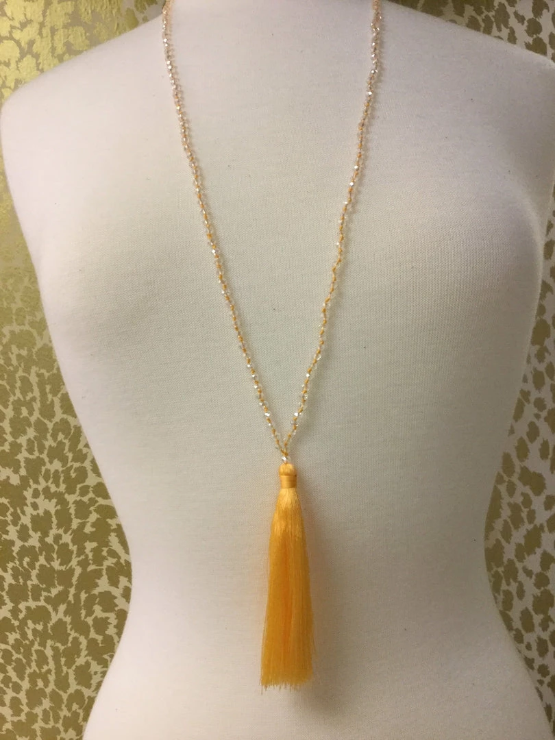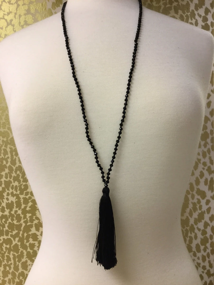 Long necklace with crystal beads spaced by knots and a dangling tassel.