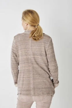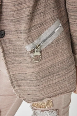 Cotton Striped Coat, long sleeve, collar and lapels with raw edge, one buttonhole closure, 2 fake pockets with large zipper pull on each side