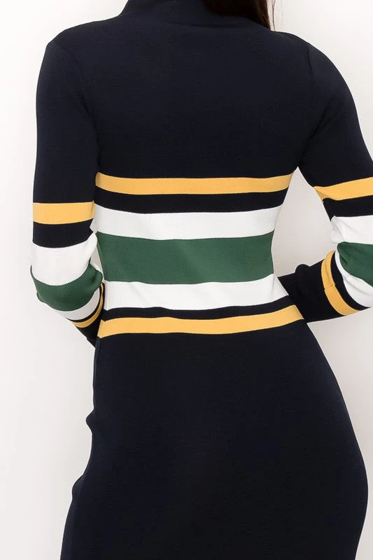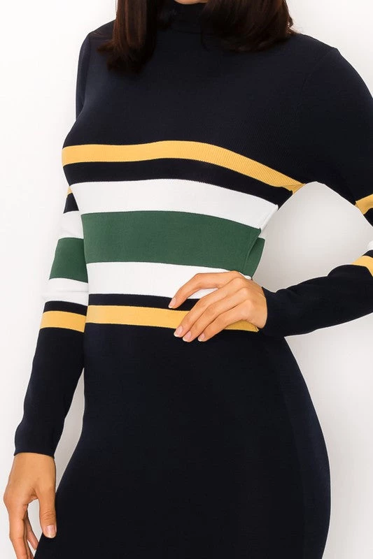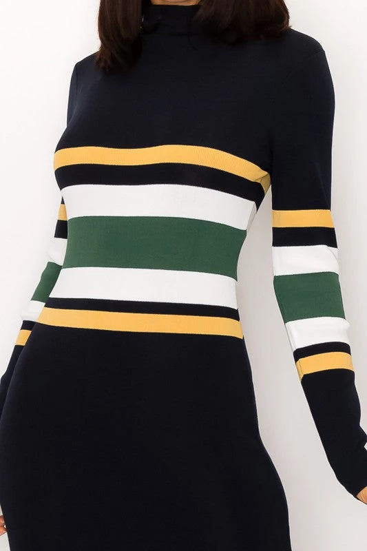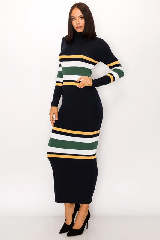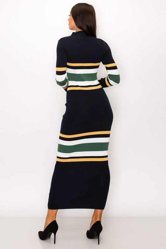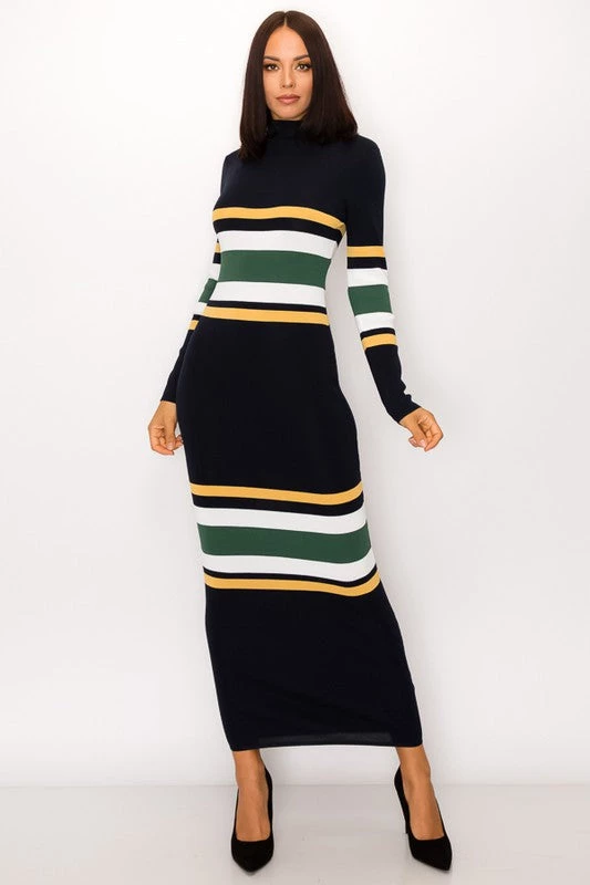 Stripe knit body con maxi dress with mock neck and long sleeves.