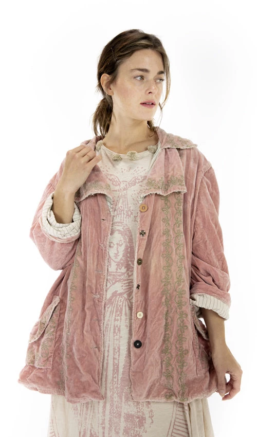 Cotton velvet rosalie jacket with embroidery hand distressing and fading.