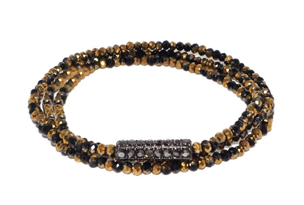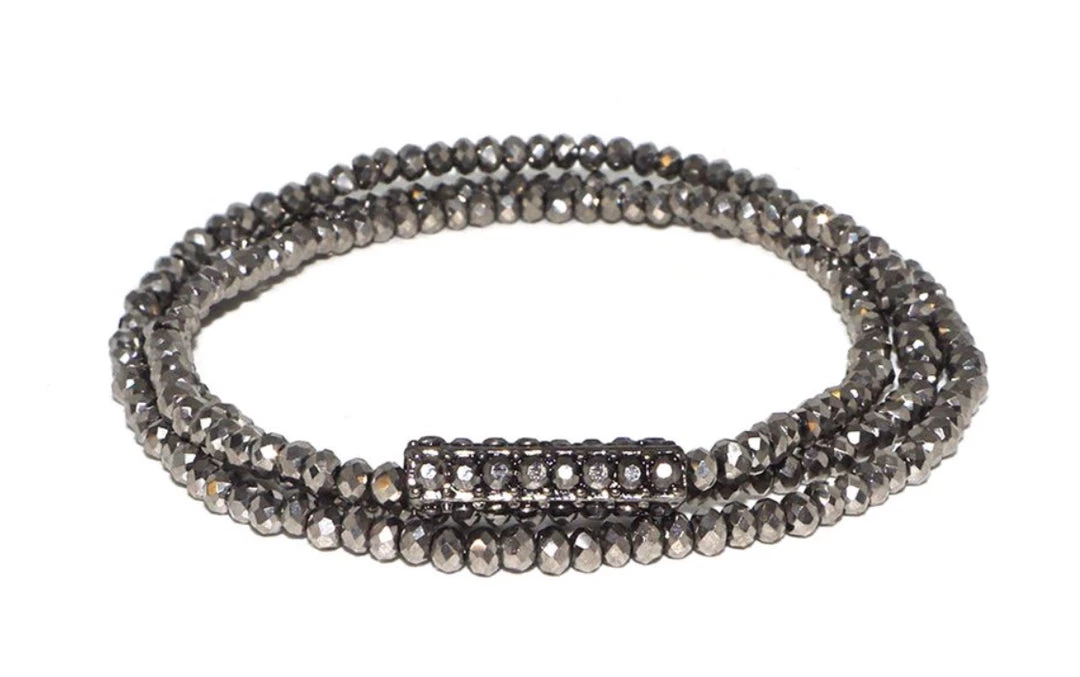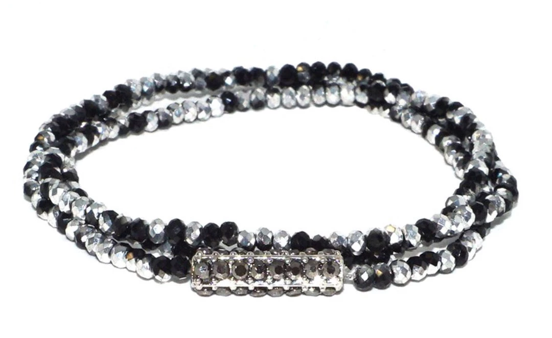 Stretchy wrap bracelet with shiny crystals and a crystal encrusted bar.