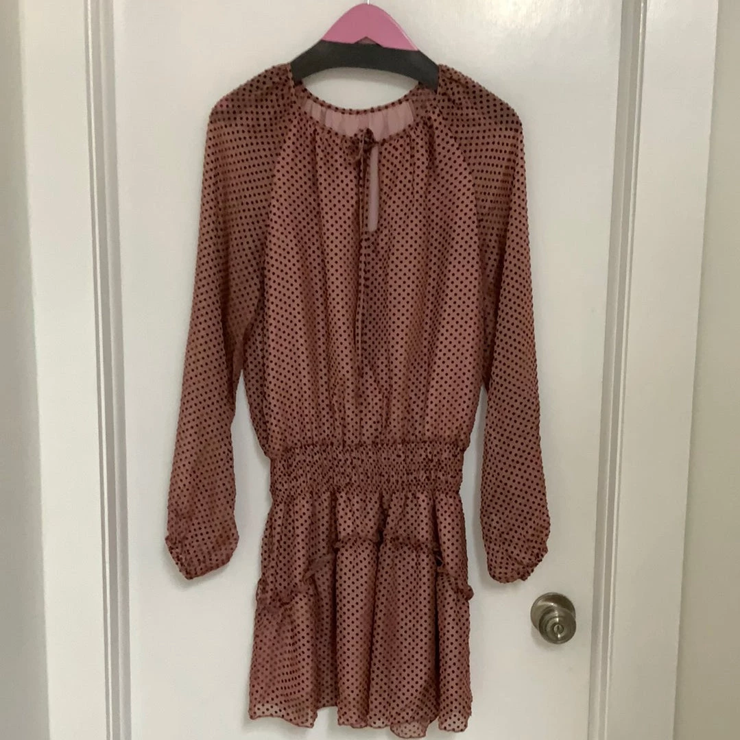 GORGEOUS AND SOPHISTICATED POLKA DOT DRESS THAT IS FULLY LINED AND SMOCKED AT THE WAIST WITH LONG SLEEVES AND TIE TOP. THIS DRESS LOOKS LIKE IT BELONGS WITH YOU IN PARIS!