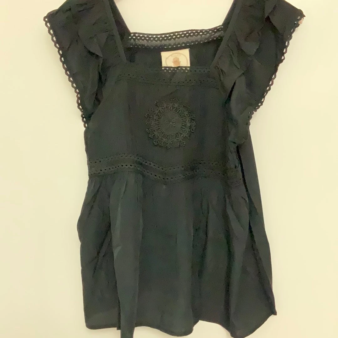 This is an adorable flirty top with ruffle sleeves and tiered top with crochet detail in the middle.