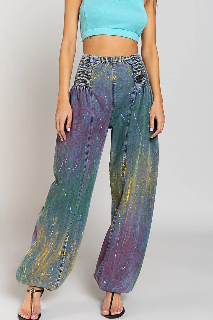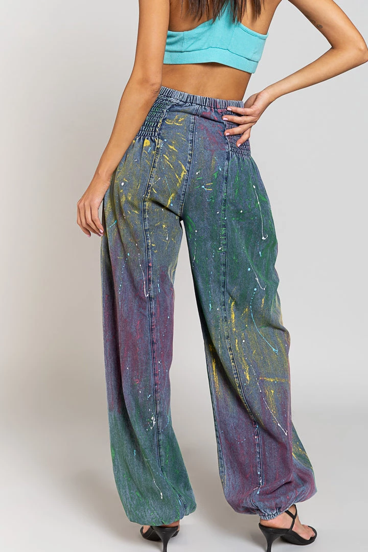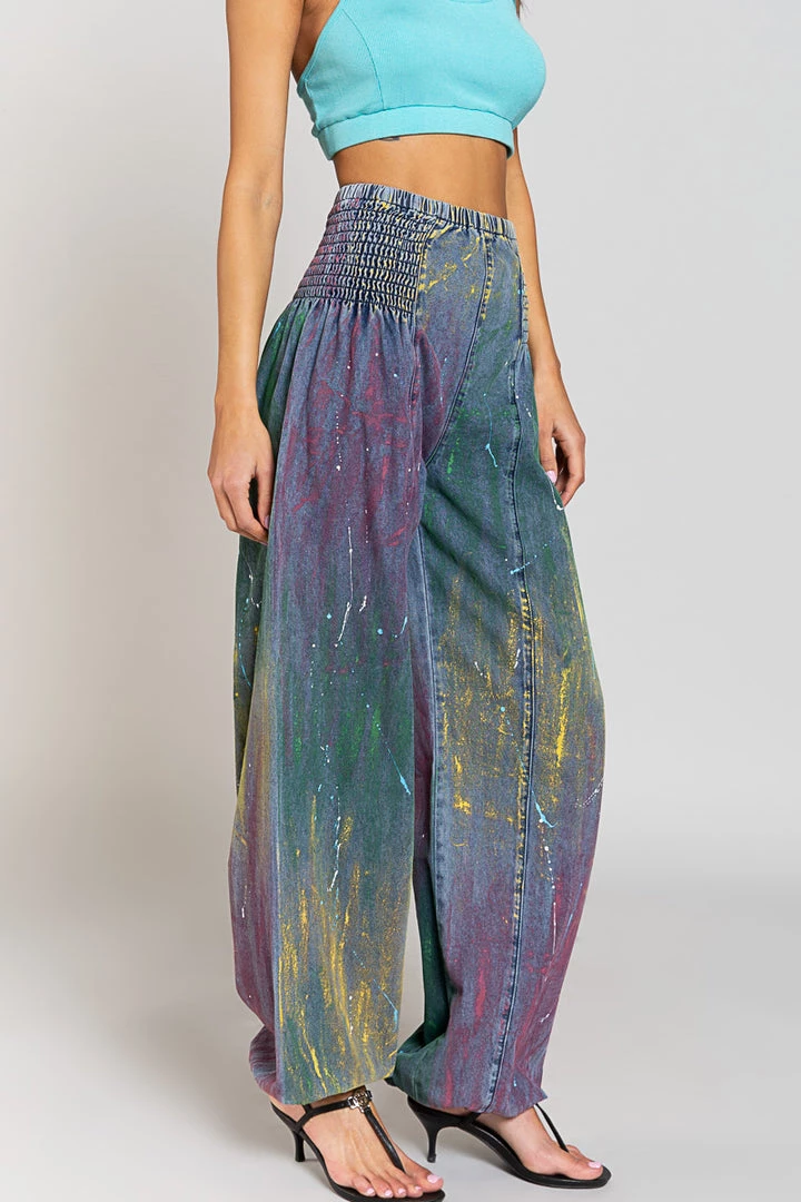 Designed in bohemian harem pants with elastic banded ankle, tie dye, smocking detailing on the side of the waist, boxy featured in chambray fabric.