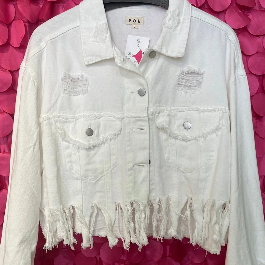TATTERED WHITE DENIM JACKET CROPPED SLOUCHY FIT BUTTON CLOSURE