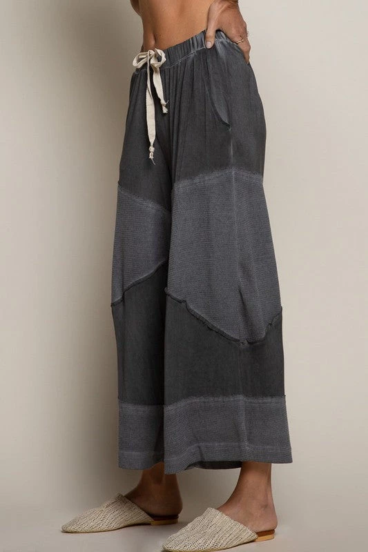 Loose knit culotte pants featuring ribbed fabrication on contrast and finished with elastic waistband with adjustable trim strap.