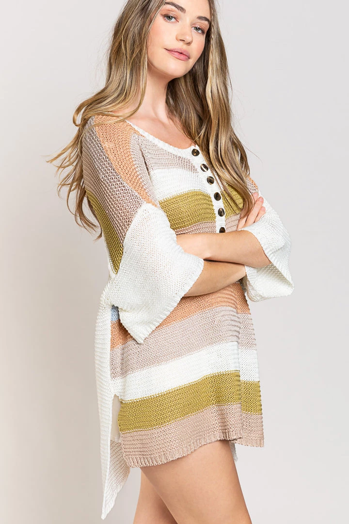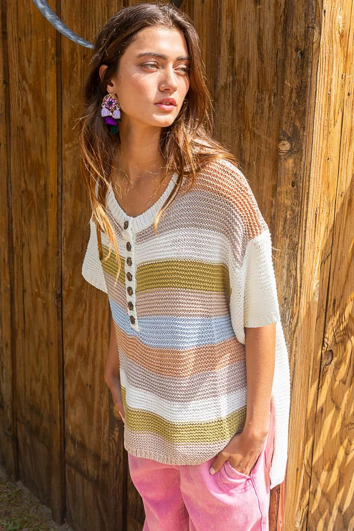 Designed in stripe pattern thin sweater, oversized fit with short sleeve, round neckline with placket, high-low length with side slit, featured in acrylic thin sweater.