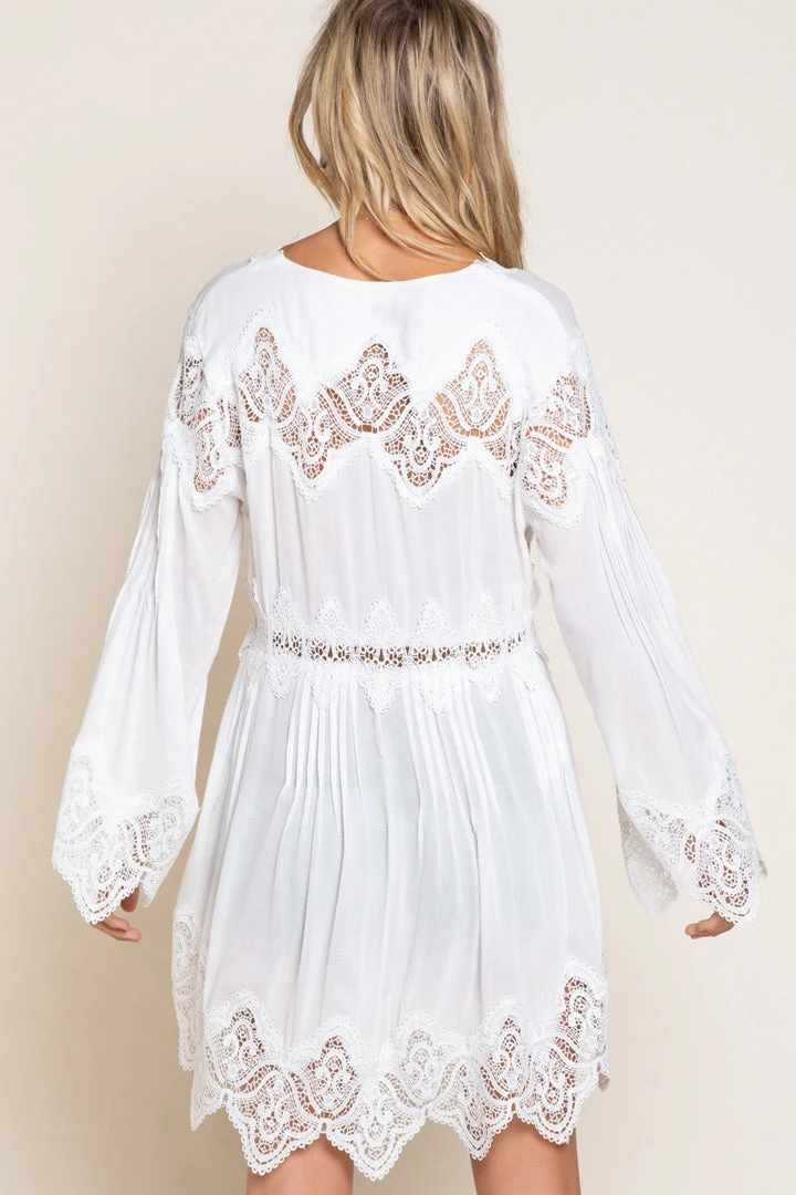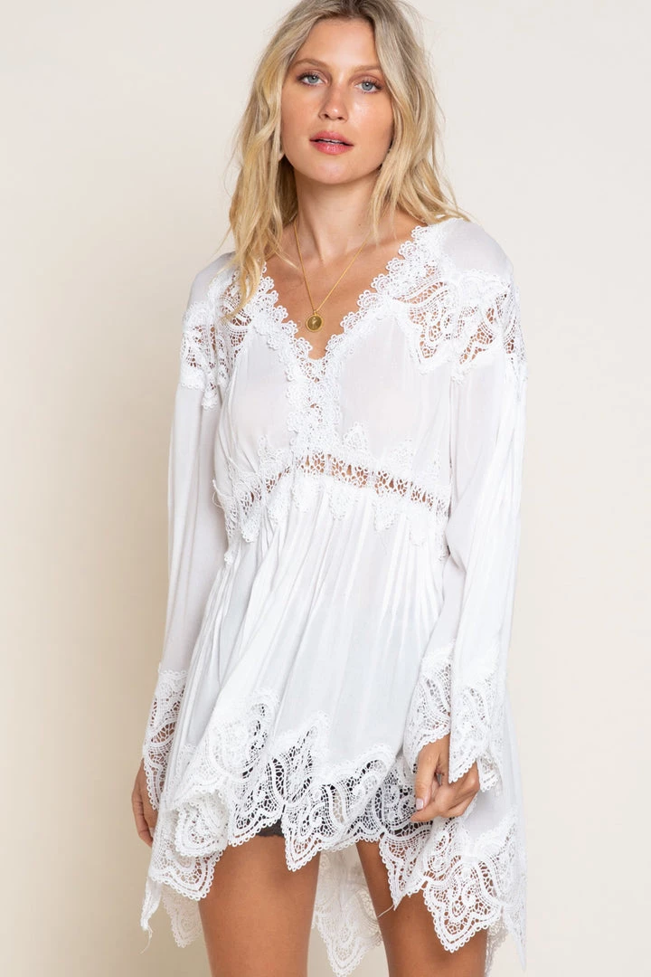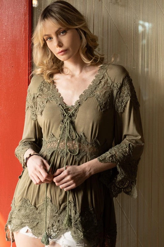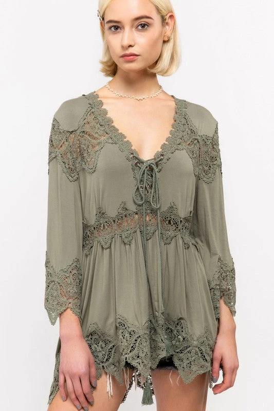 THIS IS A BEAUTIFULLY FEMININE, SCALLOP-EDGED, CROCHET-DETAILED, HIGH-LOW TUNIC TOP WITH FRONT TIE DETAIL.