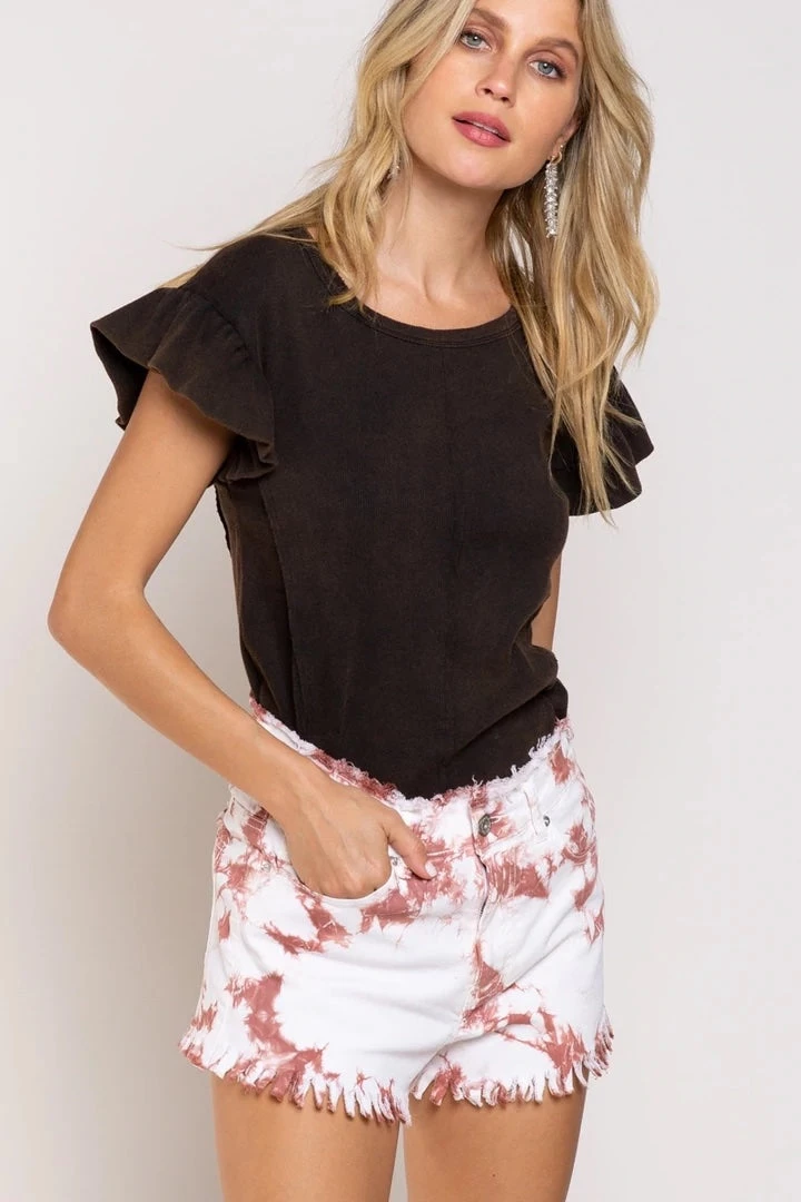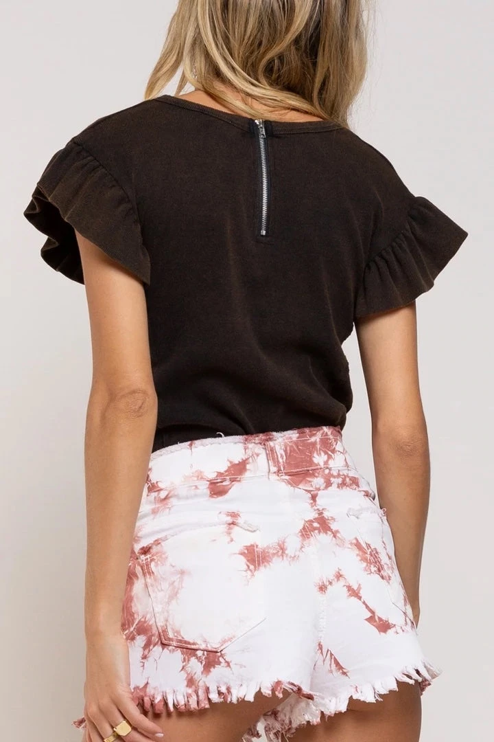 This fitted top featuring ribbed fabric that is super soft and flowy ruffle sleeve detailed. This top has a front princess seam line with raw edge finish. The silver zipper on the back neck gives a cool touch.