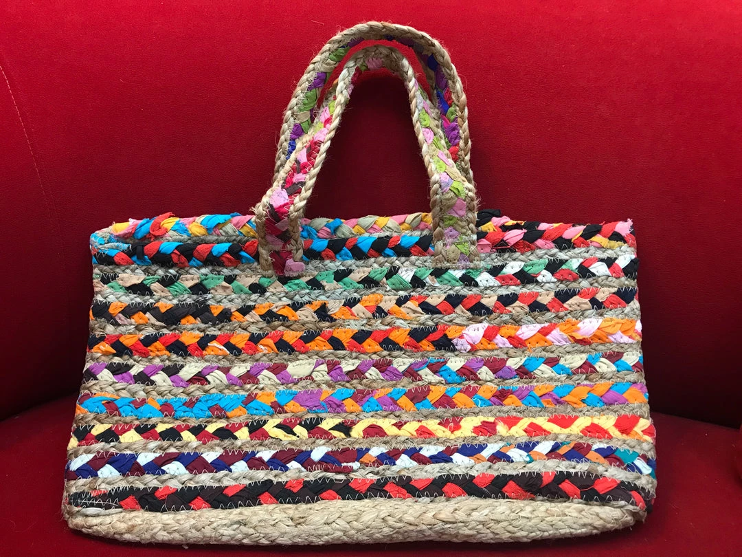 Large tote of braided fabric and jute with two top handles.