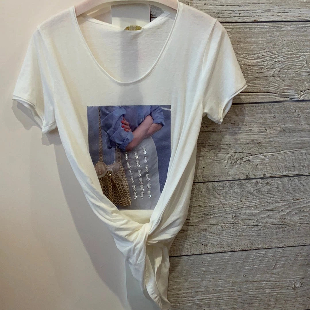 Tee shirt with rolled scoop neck, short sleeves, high low hem, and a fashion graphic with sequin and bead embellishments.