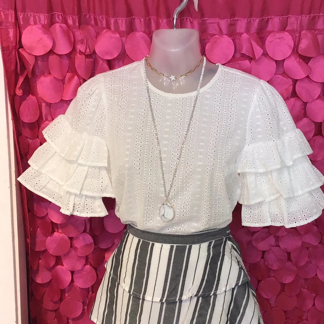 WHITE, EYELET, WITH TIERED RUFFLE SLEEVE TOP.