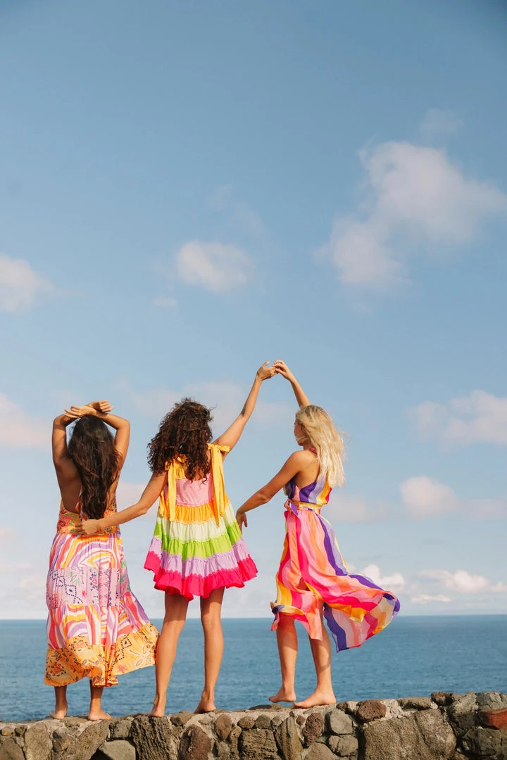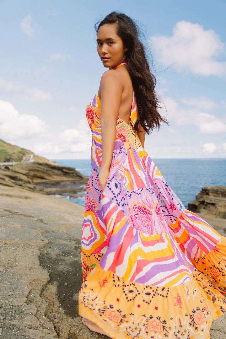 Entirely made up of gathered yokes in two exclusive Sundress prints made in a light-as-hair fabric, Camila is a very flared long dress adorned by a knot which offers a halter tie closure neckline. The very indented armholes create a rounded open back. This colorful dress will be your ally this summer.