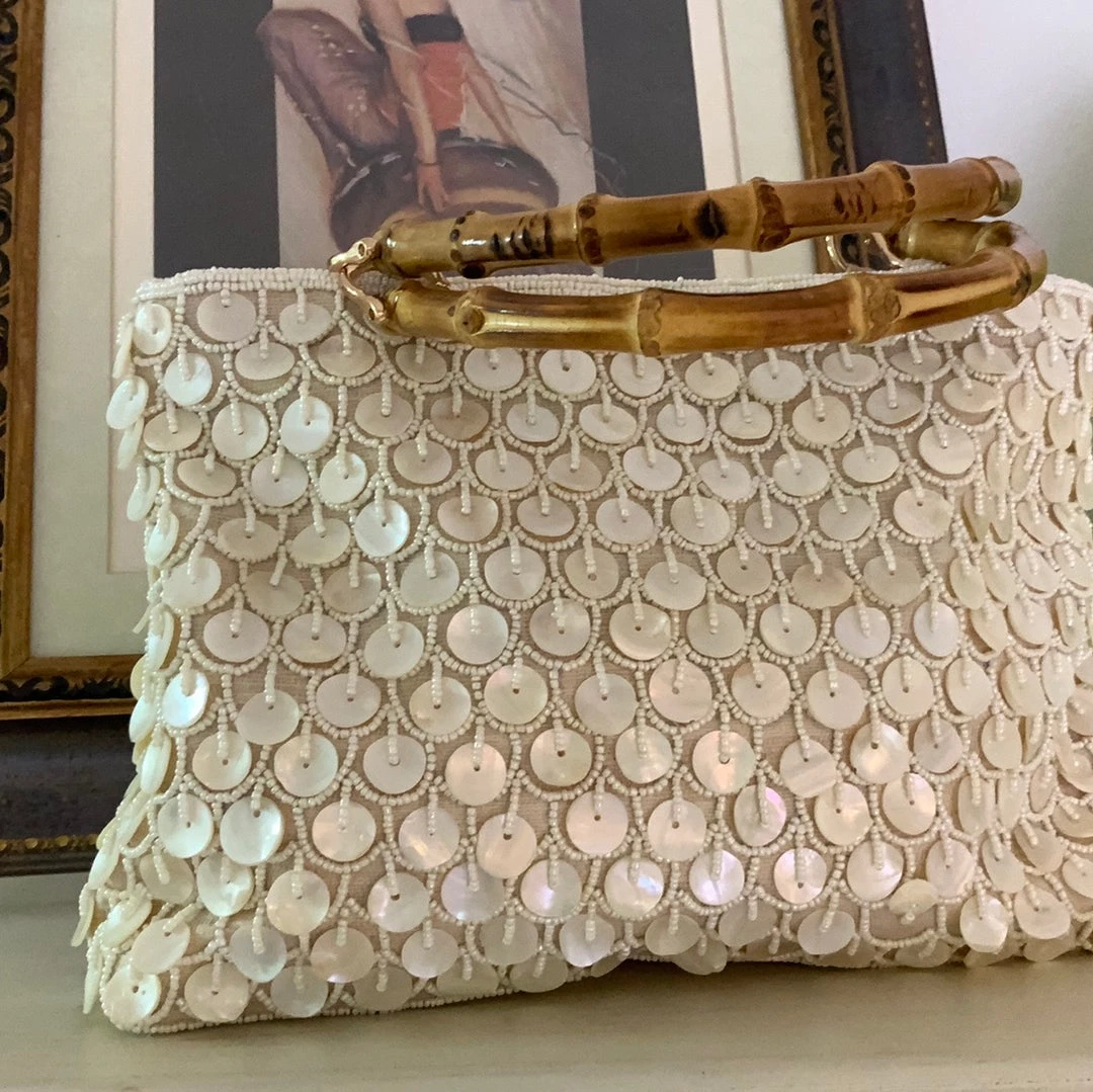 Custom white shell tote bag with bamboo handles with beaded fringe and inside pocket. Magnetic button closure.