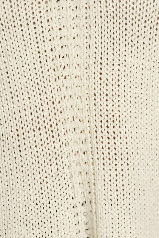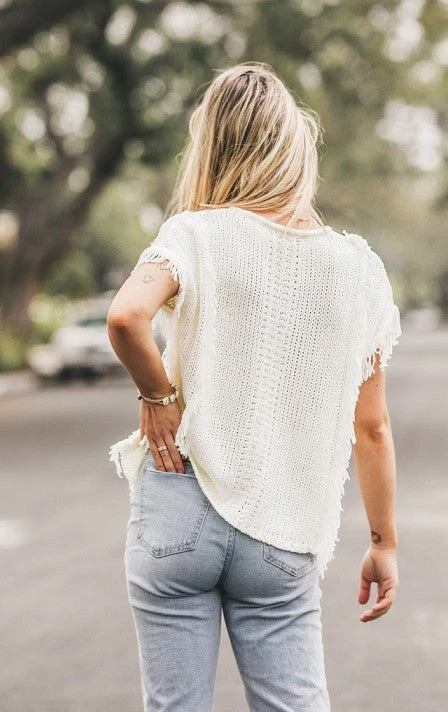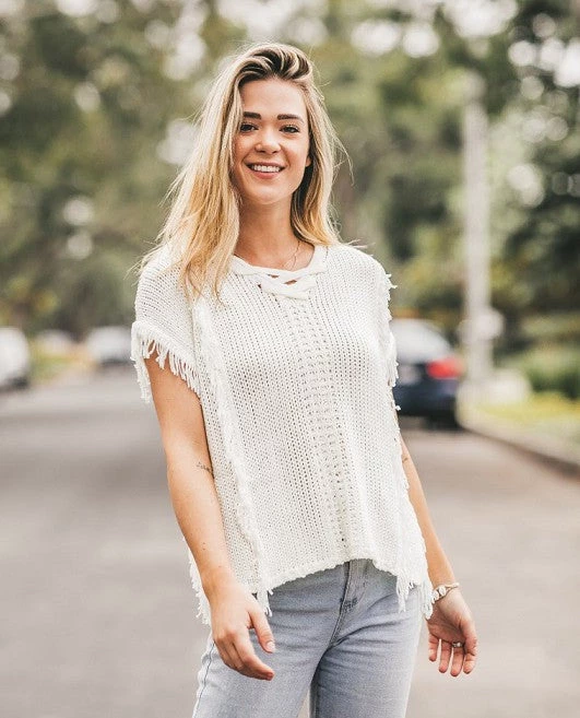 A CHUNKY, YET LIGHTWEIGHT SWEATER KNIT TOP WITH A BOHO FEEL. IT HAS A SHORT SLEEVE WITH FRINGE DETAIL, AND A LACE UP V NECK