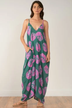 This spaghetti strap maxi dress is so adorable in pink and green batik tie dye that to me looks like sand dollars! It has pockets and is very forgiving!